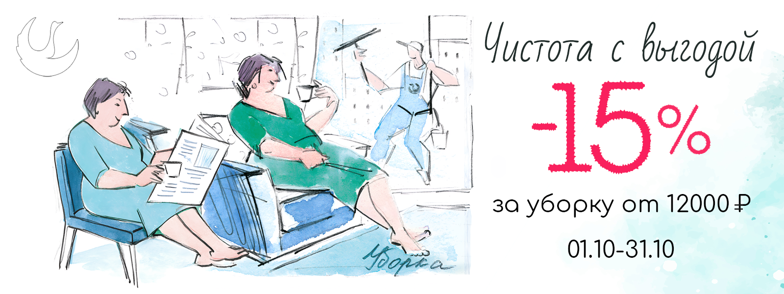 Условия акции: Скидка 15% при заказе уборки квартир/домов/офисов на сумму от 12 000 руб.
