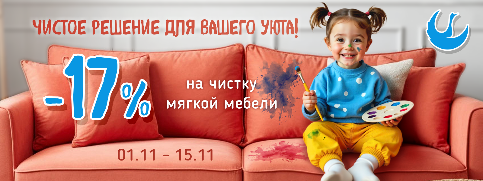 Условия акции: Скидка 17% при заказе химчистки мягкой мебели на дому или загородном доме.