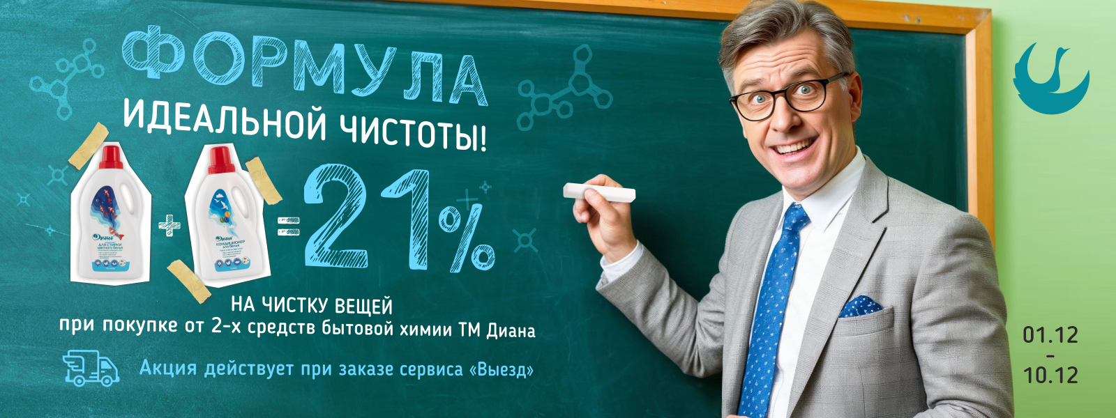 Главное условие Акции: скидка 21%* на химчистку вещей в заказе при покупке от 2-х любых средств бытовой химии ТМ  Диана при заказе услуг на выезде. Скидка 21% на покупку бытовой химии ТМ Диана не действует.